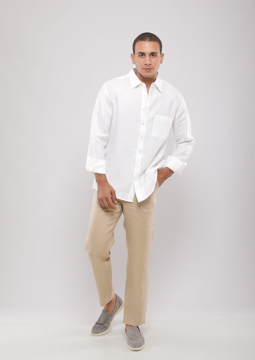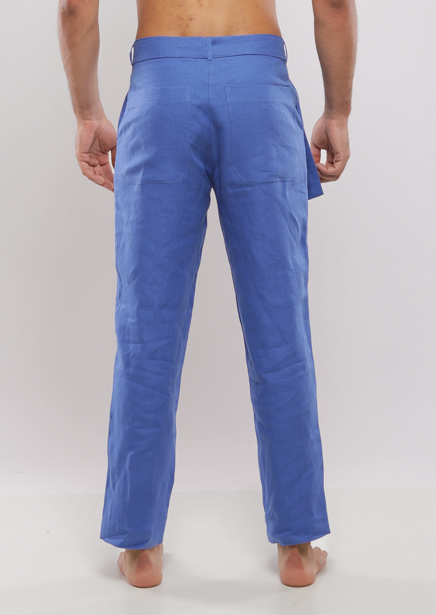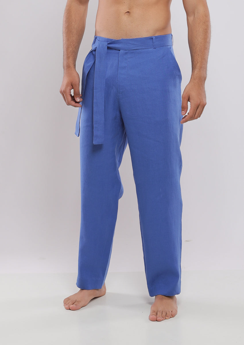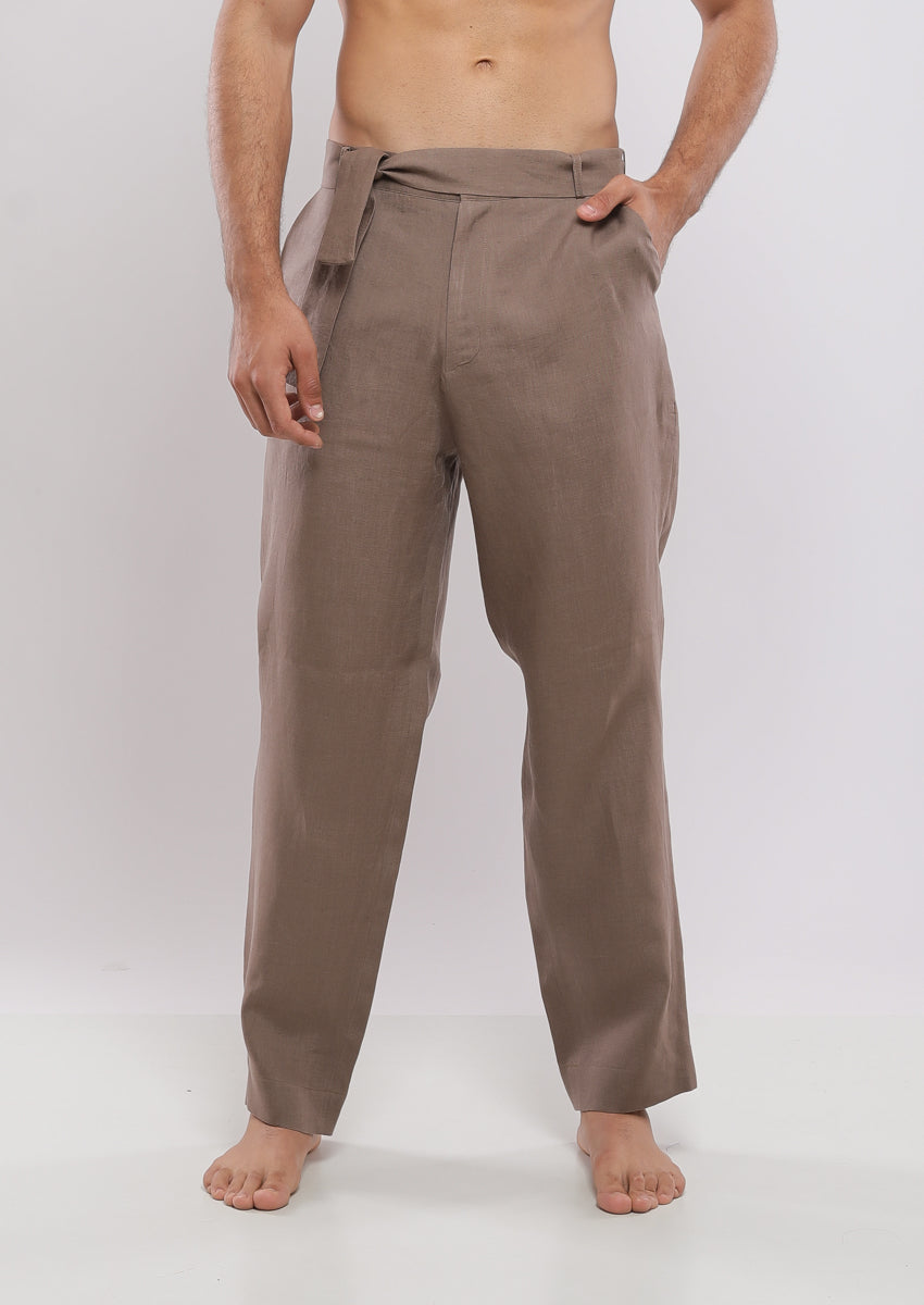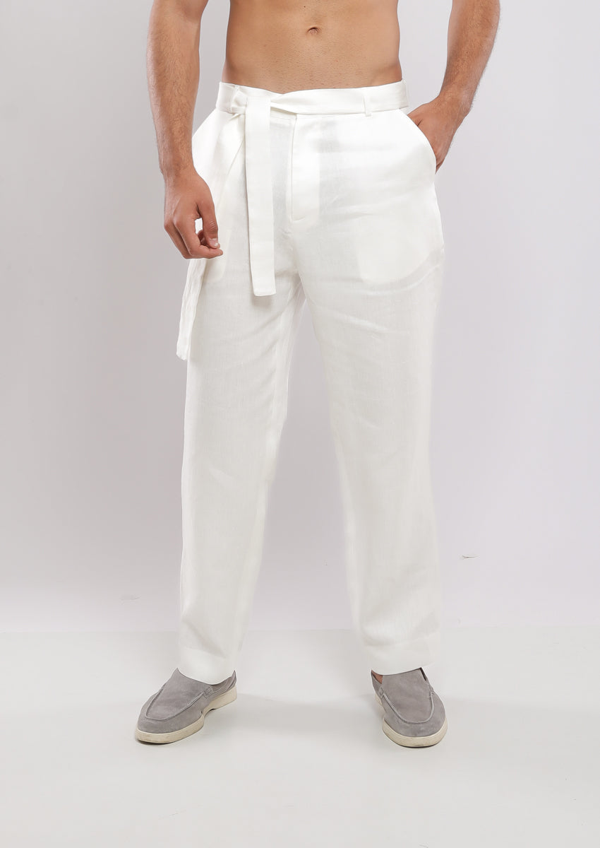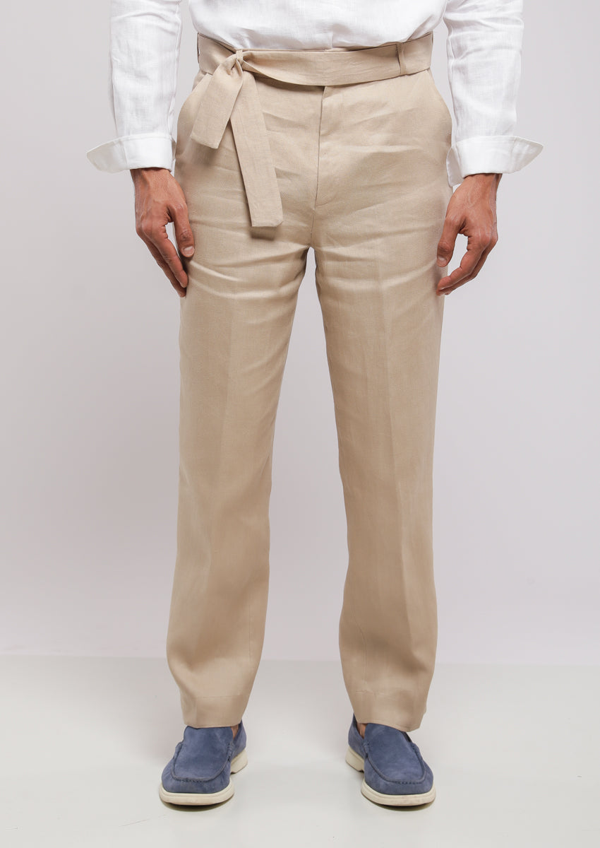 Pantalon coupe droite confectionné en lin. Taille réglable avec cordon de serrage. Poches avant et poches passepoilées à l'arrière. Braguette zippée sur le devant et fermeture boutonnée.