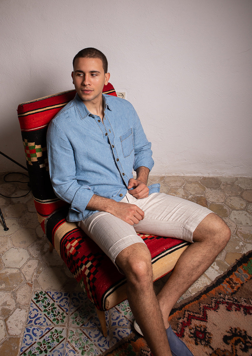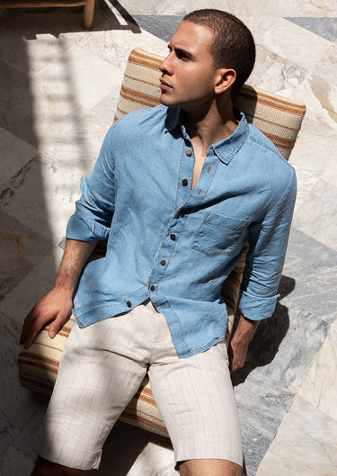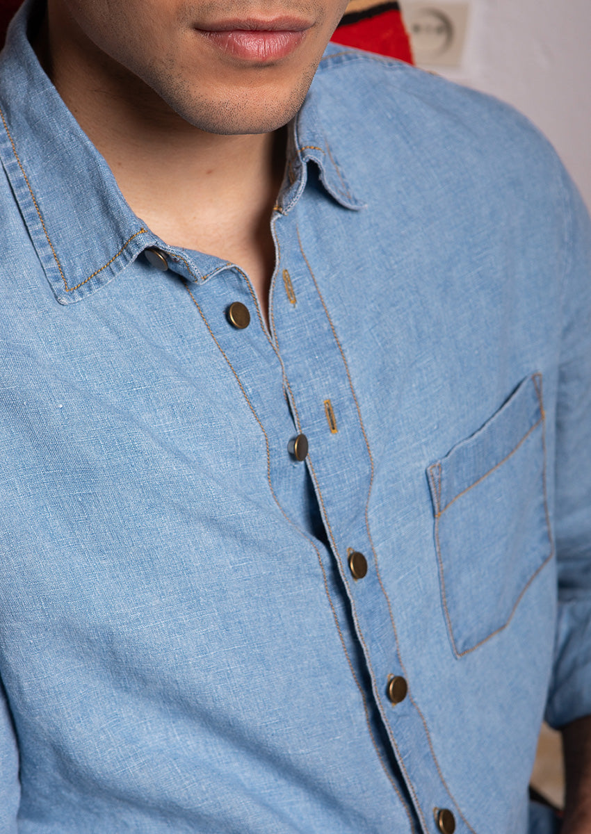 Chemise à coupe ample en 100% lin aspect jean. Col chemise monté sur pied de col. Fermeture milieu devant par patte à même, serrage apparent. Manches longues avec poignets boutonnés. Une poche plaquée poitrine. Surpiqures contrastées avec la chemise.