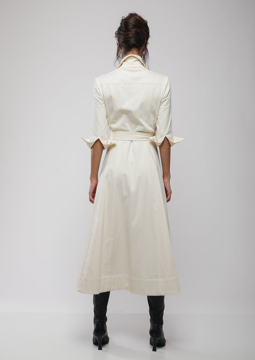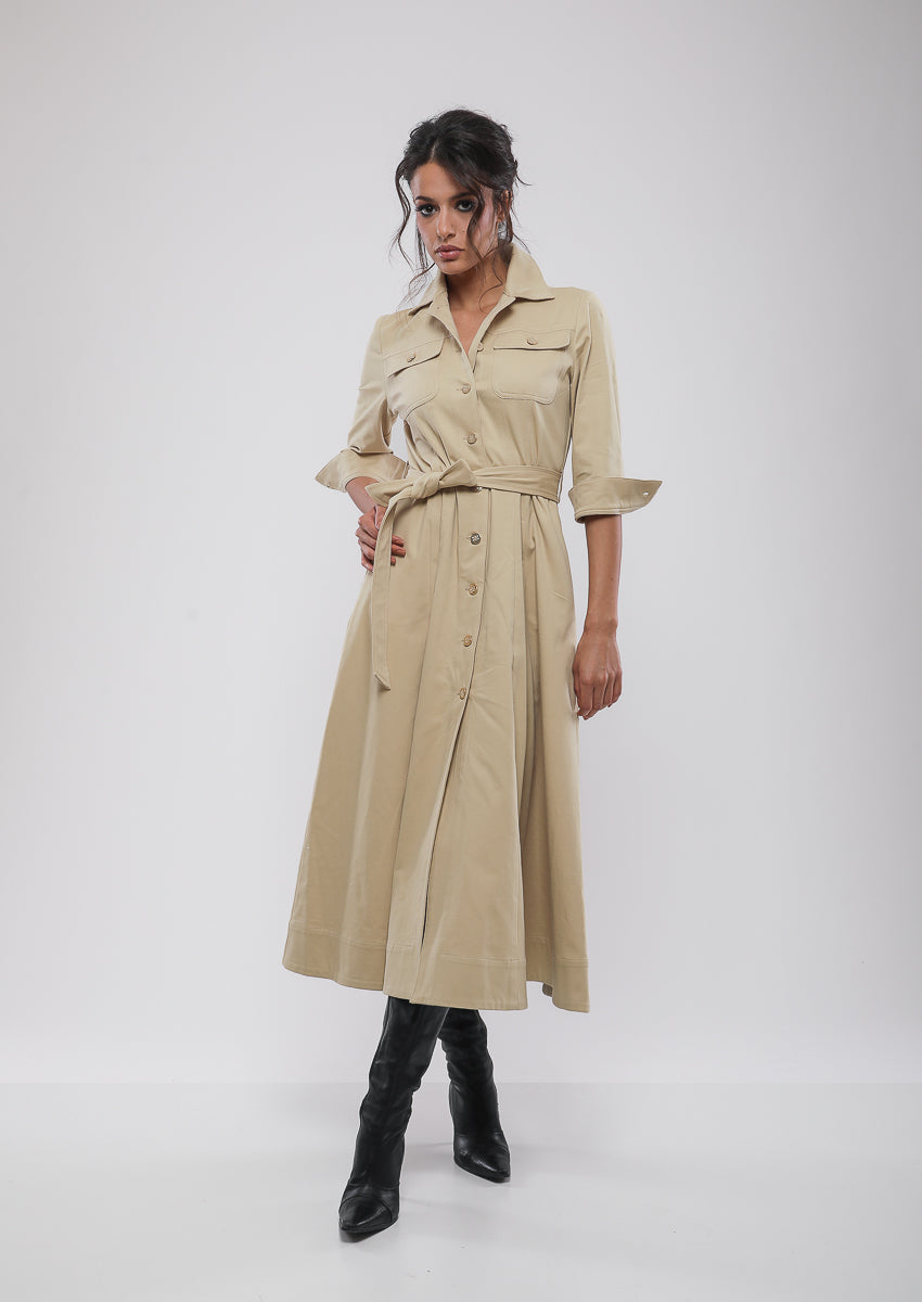 Robe à panneaux midi 100% coton , à quatre poches, patte de boutonnage, col chemisier, et une ceinture à nouer pour ajuster la taille.