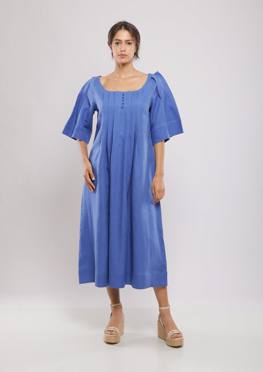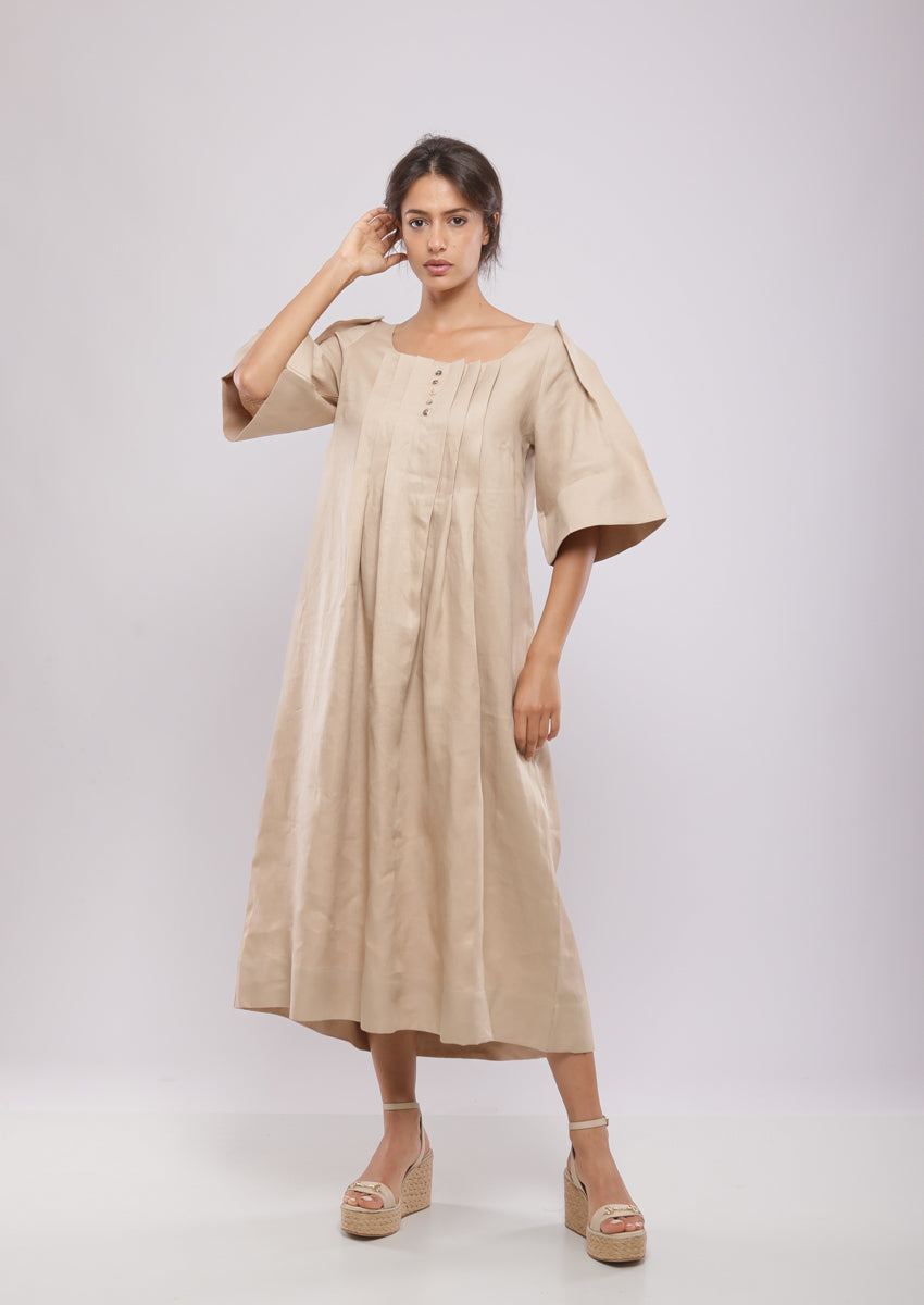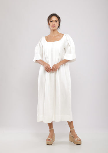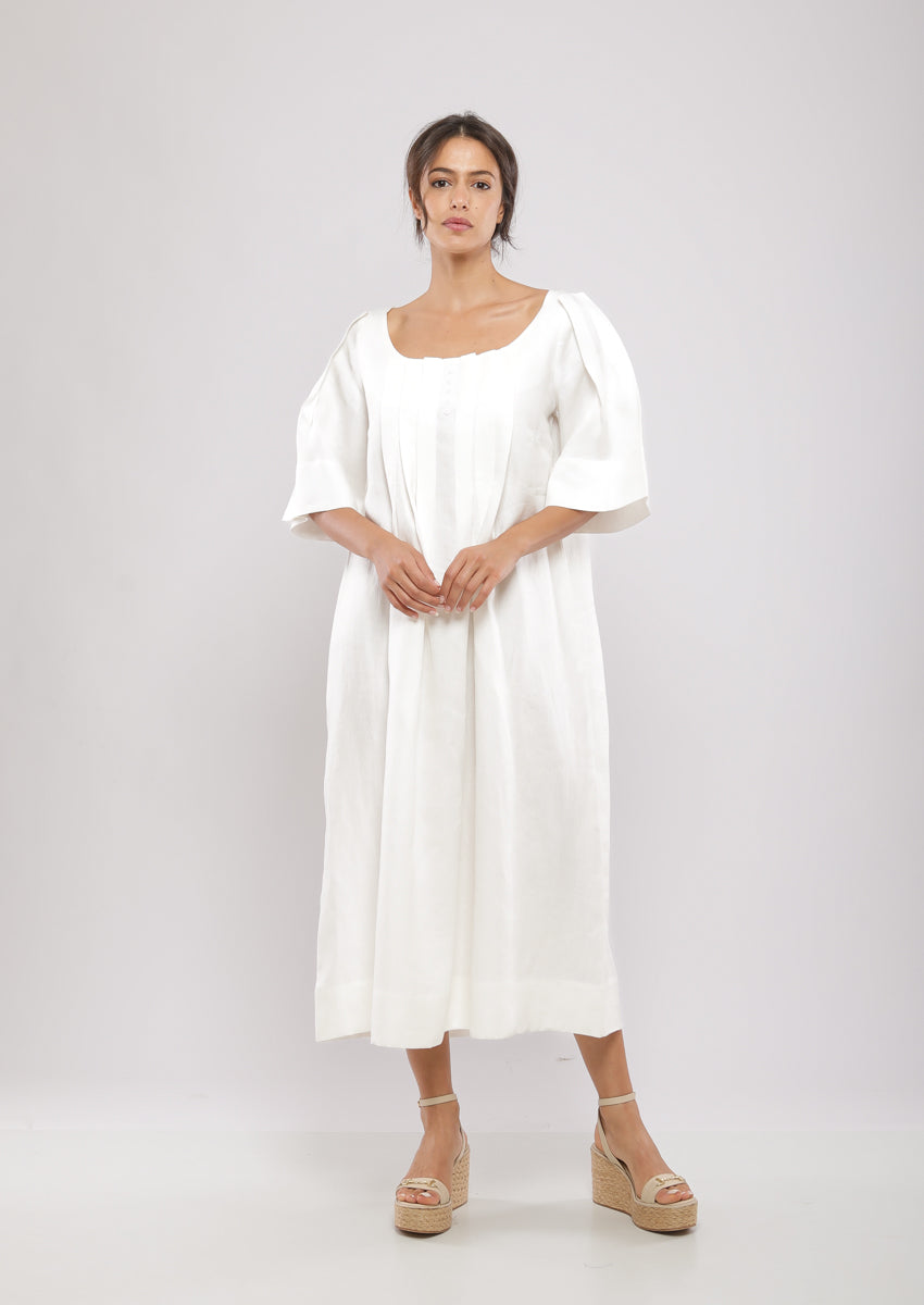 Robe midi, plissée au devant at au dos et aux manches, col décolleté
