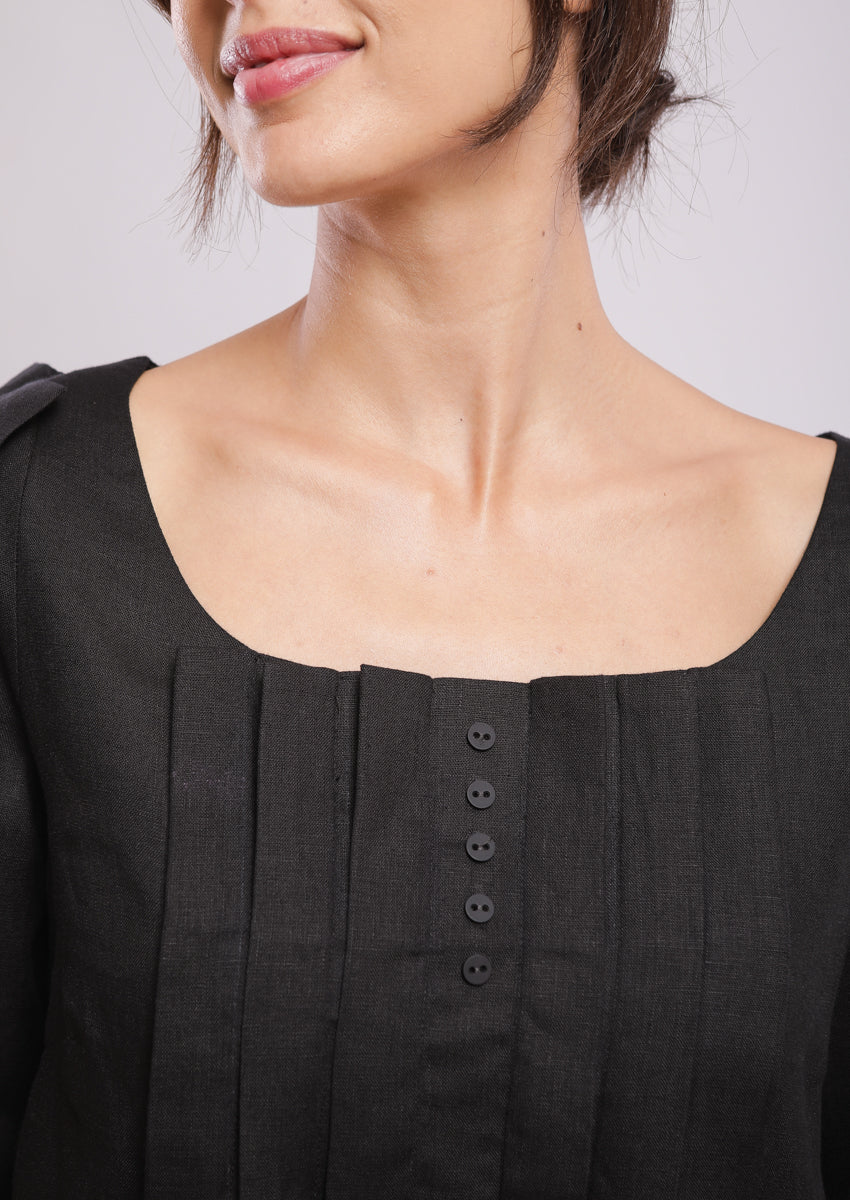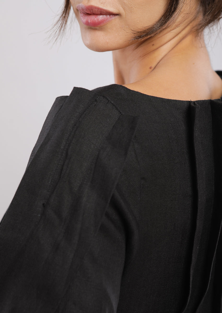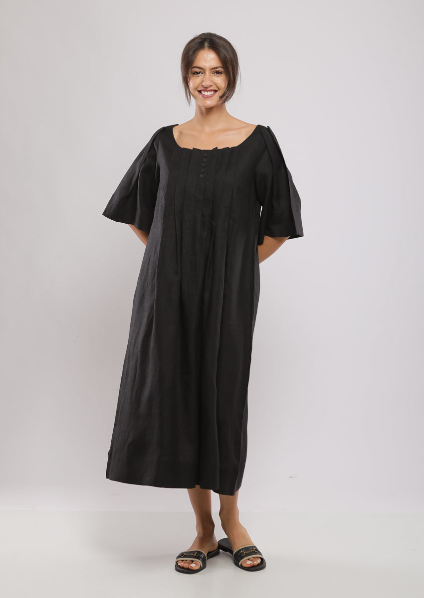 Robe midi, plissée au devant at au dos et aux manches, col décolleté