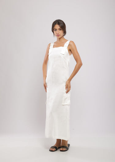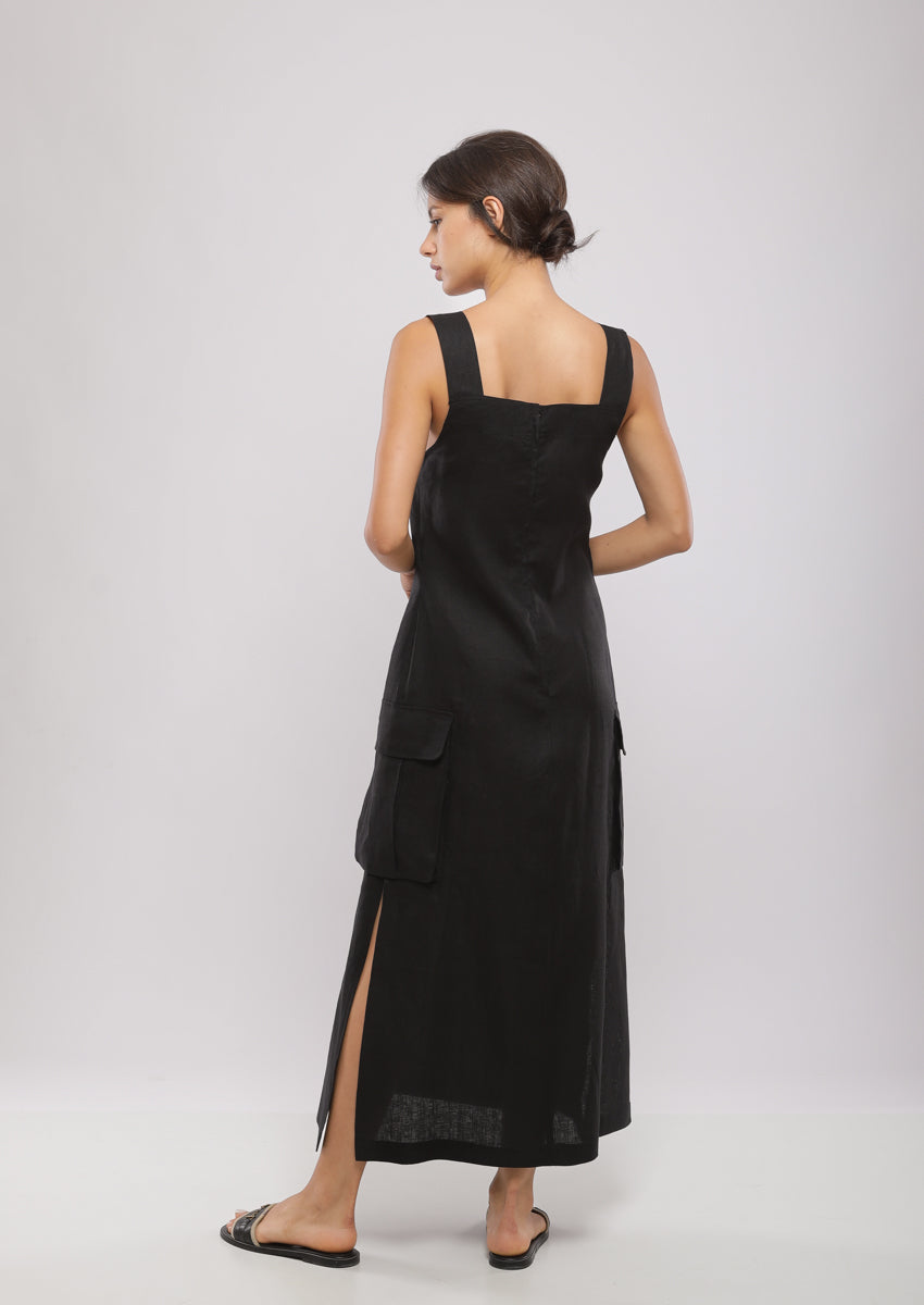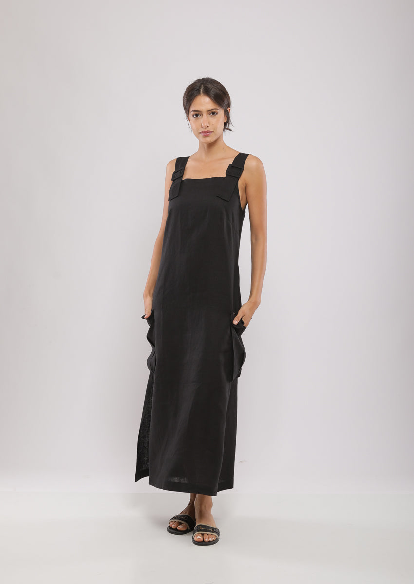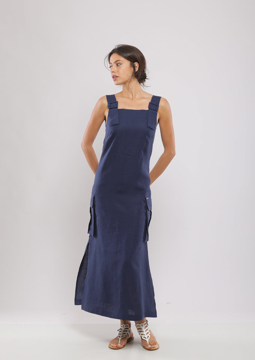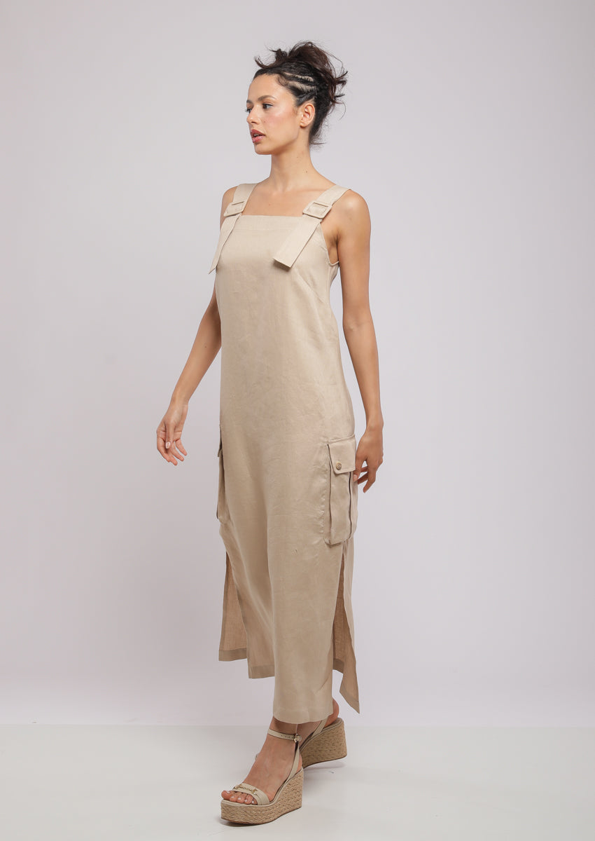 Robe salopette midi trapèze confectionnée en 100% lin avec large bretelle à boucle, deux fentes sur les côtés et deux poches soufflées à rabat